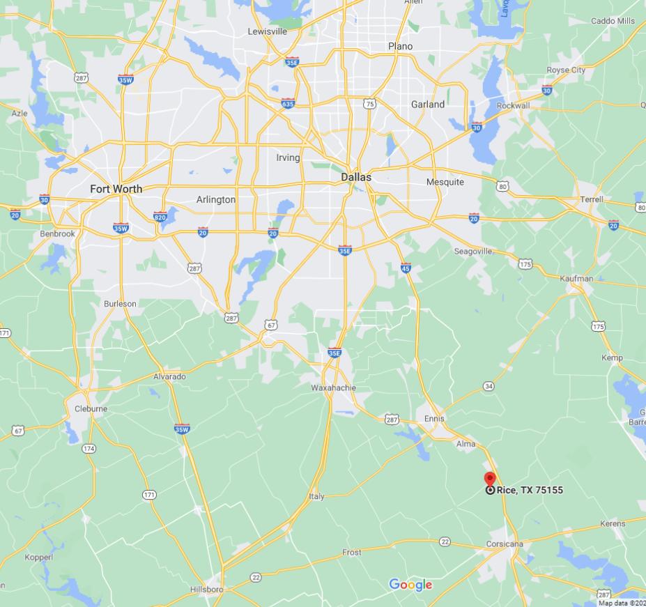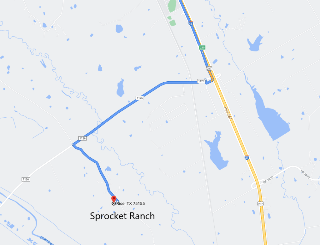Sprocket Ranch is located about 45 minutes south of DFW, and 10 minutes North of Corsicana.